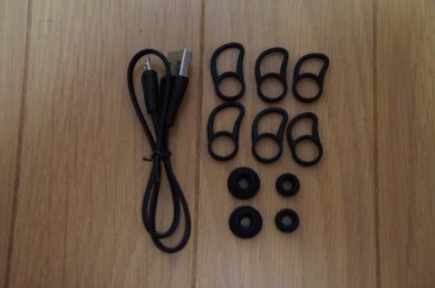 充電用のMicroUSB-USBケーブル、インナーイヤーピース、イヤーパッドが付属しています。