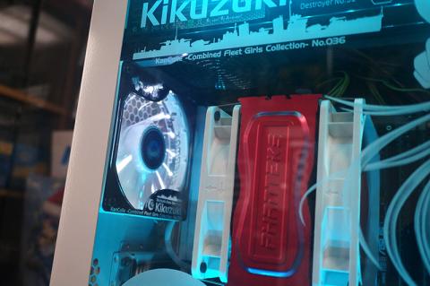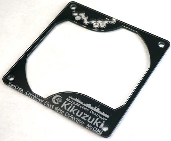 その菊月Soloをもう少しカスタムできないかということで、既製品のファンガードがついていた背面の12cmファンをターゲットに、サイドパネル作成時に渡した菊月のデータを基にデザインをお任せして作ってもらったもの。