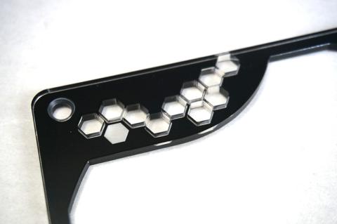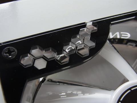 なんとくりぬき。透明なアクリルじゃなくて本当にカットされている。横のネジと比べてもらえればそのサイズと隙間の細さが判るかと。1個だけプリントになっているのは元のサイドパネルのデザインにあわせてもらったもの(元々1個だけ塗りつぶしだった)。