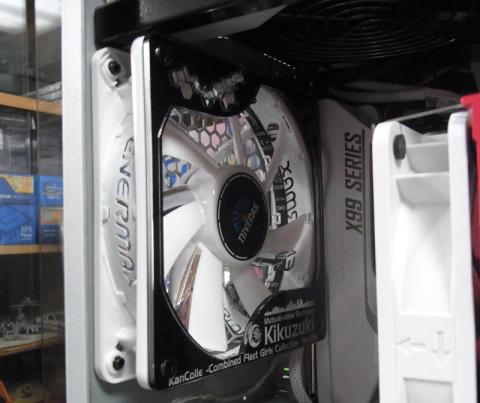 装着予定のENERMAXファンは動作時わずかにファンブレードが吸気側に浮き上がるタイプ。上記のアクリルファンガードをつけたときにキッチリつけるとガリガリと中央部が擦ってしまったのだ。