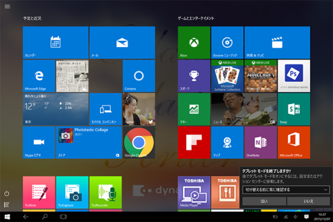 ダイアログのメッセージの言葉ぶりからして、Windows 10 の考え方は、デスクトップで使用するのが主で、「タブレットモード」はオプションのような扱いに見えます。