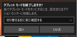 ノートPCのスタイルで使用しているとき、本体をキーボードから外すと「タブレットモードに切り替えますか?」とのダイアログが出ます。