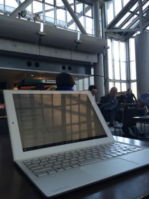 タブレットのスタイルで使用する場合は、上記のように分離した後、本体の電源を入れて使用します。このときキーボードは使用しないので、作業場所の近傍に放置することになるのですが、自室や作業場ならともかく、外出中とくに乗り物の中などでは使用しないキーボードの置き場所に困る場面はあります。