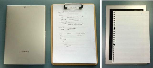 本体の大きさはA4の紙ばさみと比べるとこんな感じです。質感は異なりますが重量感覚としては、dynaPad N72 を本体とキーボードを合わせて収納状態にして手にしたとき、A4版の紙ばさみに20、30枚くらい挟んだ状態と同じくらいです。