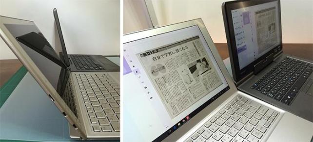 V713もdynaPad N72 も機構は異なりますが、ノートPCのスタイルで(つまりキーボードを付けて)開いたときの角度は自由に変えることはできない構造です。角度の設計は、使い勝手に直接影響しますから重要です。この点、dynaPad N72 は画面を見たりタイピングするのに適切な角度に開くので、より自然な姿勢で作業することができるデザインとなっています。