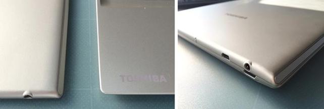 背面ボディとキーボード周りはカタログによると「サテンゴールド」に塗装されています。ゴールドというには黄色みが少なく、むしろ落ち着きのあるマットなシルバーといった趣です。塗装の耐キズ性は、実際使い込んでみないとわかりません。経験上想像するに、手の触れる頻度が高いキーボードのタッチパッドの両脇(パームレスト部)や各部の外側になる角の塗装が使用にともなって薄くなっていくのかもしれませんが、これはタブレットとして使用する以上は仕方のないことかもしれません。