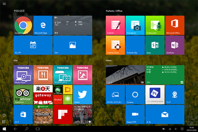 Windows 10 では、「タブレットモード」が新設され、ノートPCを含むデスクトップ機で使用する場合とでUI(ユーザーインターフェース)が明確に分けられているので、タブレットもデスクトップも共通のUIで済ませようとしたWindows 8 のような混乱はなく、操作しやすくなっています。