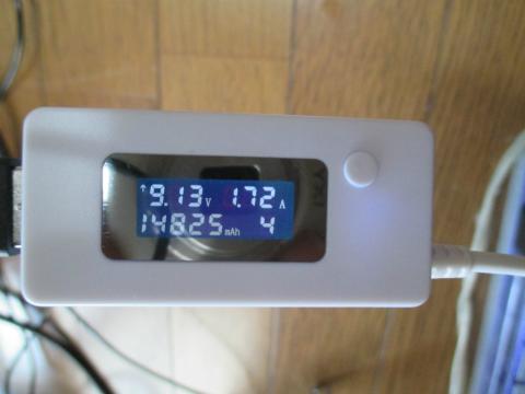 ↓付属のACアダプタ、電源ケーブルで充電すると写真の様に9.13V、1.72Aとなっています。