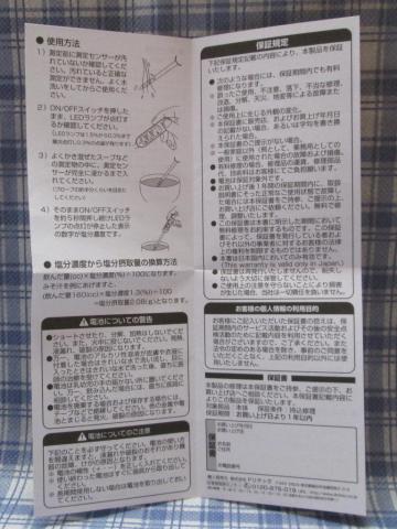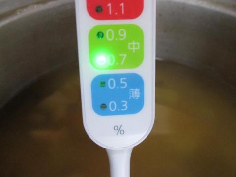 このような塩分計を使って、普段の料理の味付けと塩分濃度の関係性を明白にして、今後の料理の塩加減に反映できれば、と思います。