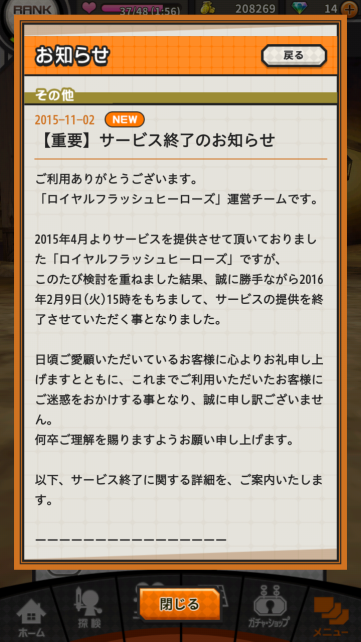 アイコンの通り最近大型アップデート来たのでちょこちょこやってたんだがその矢先のサービス終了告知wwwww