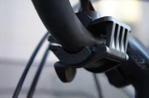 自転車に取り付け、iPhone6 Plusを載せてみました。ホルダーが細いので、やはりゴムバンドはした方がいいでしょう。というのは、自転車は振動がもろに伝わるからです。