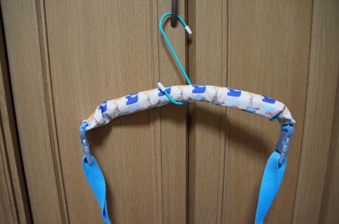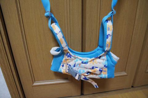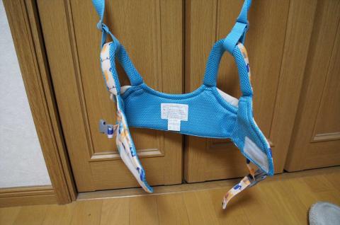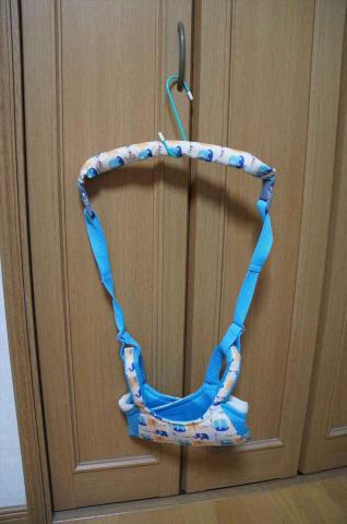 この取っ手をお母さんが持ち、歩行の補助をするわけです。取っては外すこともできます。外した時は、両手で2本のひもで補助をします。