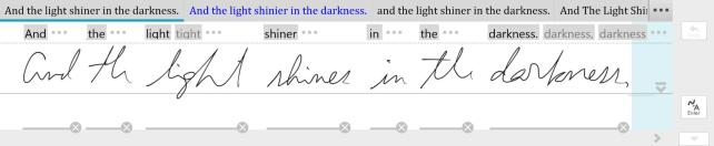 5.について。テキストボックスとは、上でAnd~とか書いている場所のことです。この中では消しゴムが反応しません。修正したい場合は、Undoっぽい挙動のBackspaceを使わざるを得ません。これができるのは最後尾の最後の一画を順番に消していくことのみ。真ん中当たりの文字が誤認識されたから修正したい、という時は×でその文字全体を消すよりなく、文字の二画が繋がってしまったから消しゴムで真ん中を消してきちんとした文字にしたい、というのはできません。書き順も認識率に影響するから、というのは分かりますが、正直非直感的でストレスのたまる挙動です。