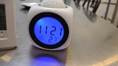 なんちゃってプロジェクターを内蔵しており、ドームを押すと赤色LEDが、壁や天井に現在の時刻を映し出します。