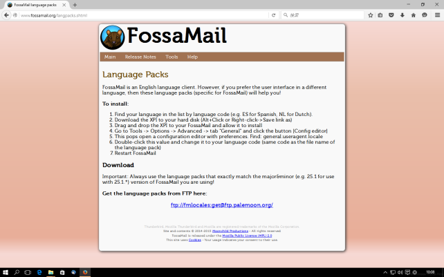 上部のメニュー,Tools にマウスオーバーすると出るプルダウンメニューから,FossaMail Language Packs のページに進みます。