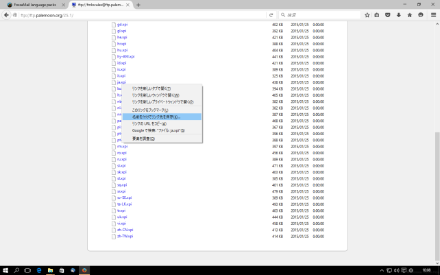 Firefox で ja.xpi をクリックしてしまうとアドオンのインストールをしようとされてしまいますので,(右クリックのコンテキストメニューから)名前を付けて保存します。