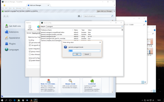 オプション画面を開いて,Config Editor から useragent で検索して ja に変更