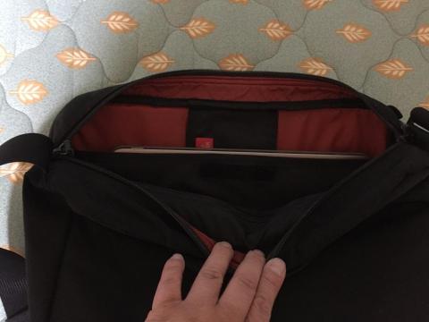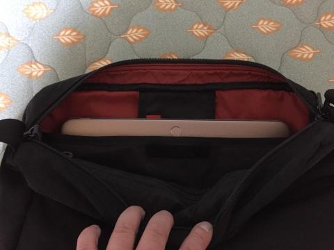 前面部のファスナー付きポケットには8インチのタブレットまでなら収納できます。