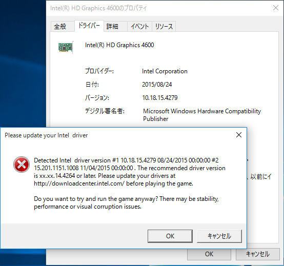 なんと、Corei7-4770K内蔵GPUでゲームを起動したら、こんなエラーが。
