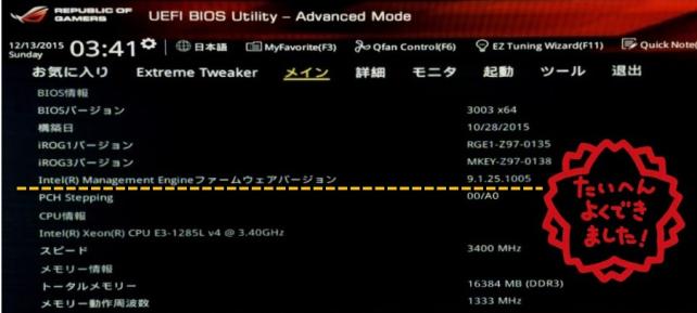 下小川さん、ふっけんさん、あまたりんさん、araragiさん、KAOさん他のアドバイスいただきましたが、インテルManagement Engineが更新されていない9.1.25.1005になれば大丈夫らしいという情報を頂きました。