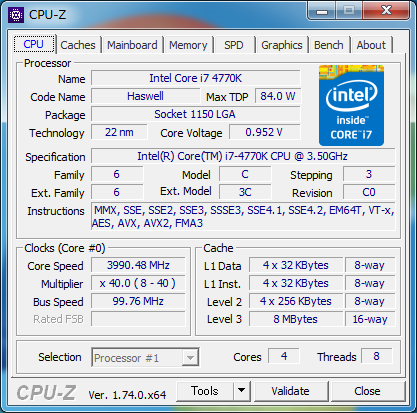 テストに入る前に、まずはCPU-Zでそれぞれの詳細を確認しておきましょう。まずはCore i7-4770Kです。