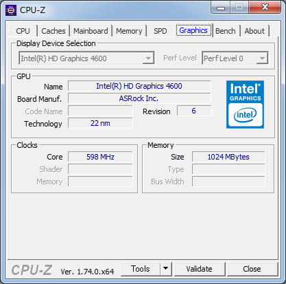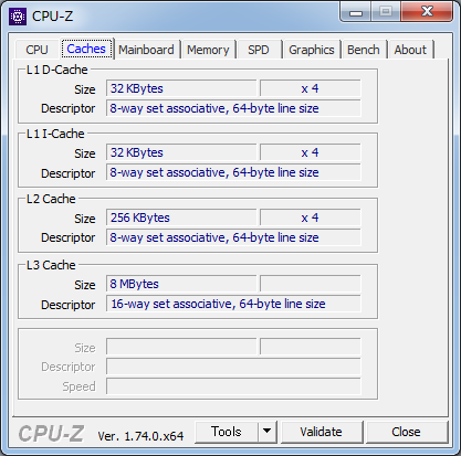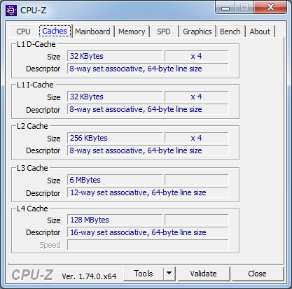 キャッシュのタブでは、eDRAMがL4キャッシュとして認識されていることが判ります。今までCPUは色々使ってきましたが、L4キャッシュという表示を見たのはこれが初めてではないかと思います。