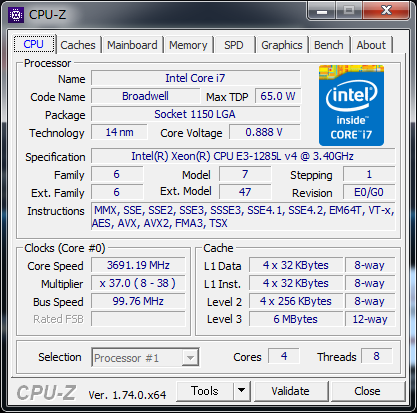 インテル(R) Xeon(R) プロセッサー E3-1285L v4はコンシューマー向けの製品ではないためか、情報があまりはっきりと出て来ません。CPU NameはCore i7と表示されてしまいます。