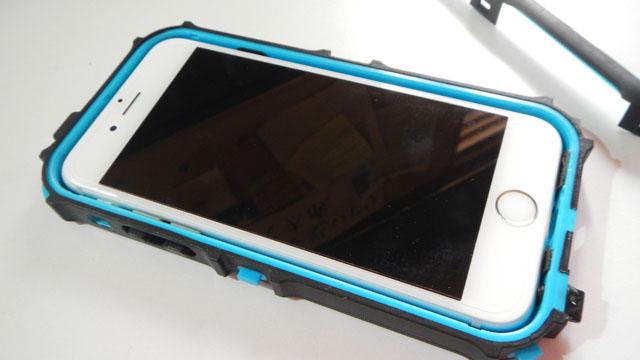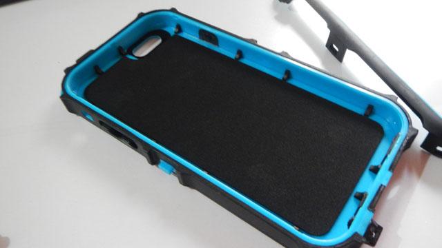 iPhone背面を数か所のゴムとスポンジで支持し衝撃から守る構造