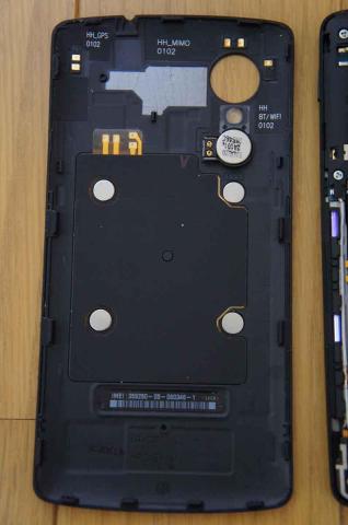 Nexus5のバックパネルを外したところです。この部分と充電台が接地していたらいいので、充電だけに限って言うと、直径5センチもあれば問題なく充電できます。それでは置いた時に不安定になるということで、台を大きくしているわけです。