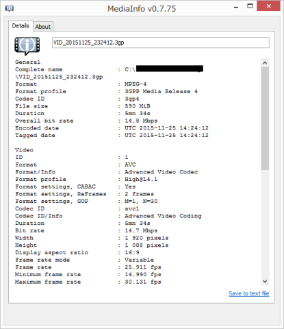 「最高」画質を選択した場合、解像度は1920×1088(←1080の間違いではない)になりました(;^ω^)・・・画質はさすがに良いとは言えませんが上記の解像度で5分34秒の動画で590MBなのでわりとコンパクトですね。フレームレートは可変です。形式は懐かしの3gp。