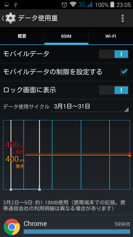 もちろん、500MB未満の無償の範囲で使うつもりなので、データの制限は400MBで警告、450MBで遮断としました。(誤差があるので多少余裕をみておきましょう)