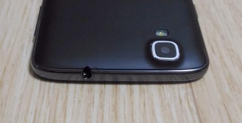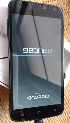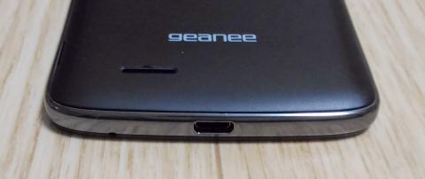 普通にプラスチックのカバーが付いています。カメラ付近がちょっと安っぽさを感じさせますね。geaneeのロゴの横の穴はスピーカーです。手前のは電源ボタン。下側にはカバーを開けるときの穴があります。