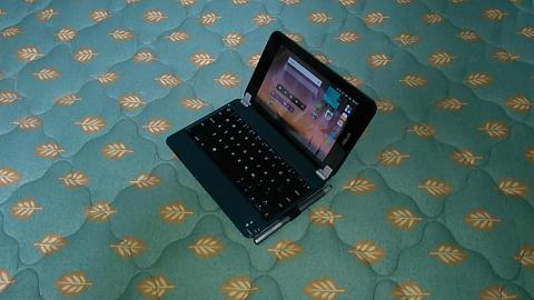 iPadMini用のキーボードと合体させるとスマホ→タブレット→ノートPCとして遊べます。