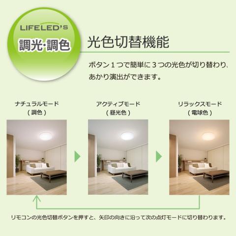 - リモコン:連続調光(100%~約10%)、多段調光(100%~約10%(10段階))、LED常夜灯(7段階調光)、滅