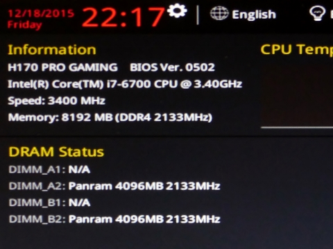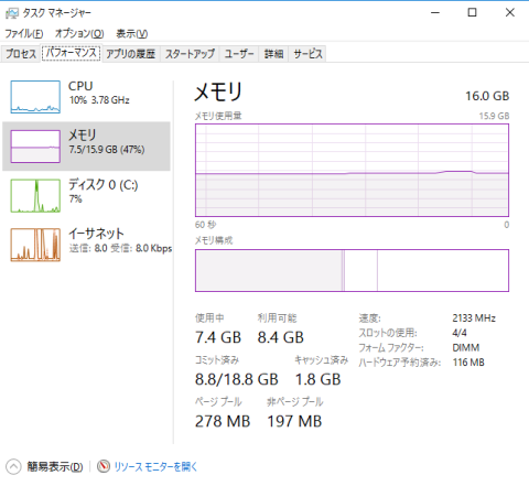 メモリーはCFD W4U2133PS-4G(DDR4-2133)で4GBを2枚差し