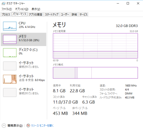 比較用のIntel Corei7-3770+GTX560のPCは8GB×4=32GBだったので、余裕がありました。