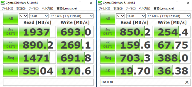 残念ながら2,000MB/sには届きませんでしたが、SSDのRAID0を遙かに超える読み書き性能です。