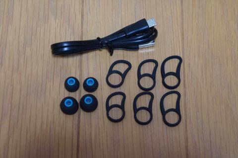 充電用のMicroUSB-USBケーブルと、2種類のイヤーパッド、3種類のイヤーフックが付属しています。