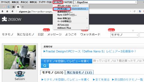 FireFoxのメニューバーの「ツール」-「アドイン」をクリックします。