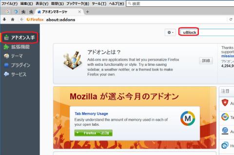 「アドインマネージョータブ」が出て来ますので、右上の検索窓に「uBlock」と入力しエンターキーを押します。