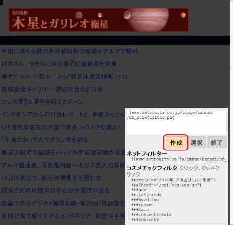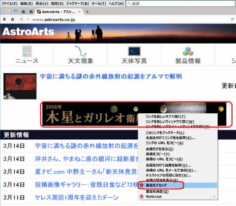 「AstroArts」さん、すいませんね、広告と言うよりも画像の読み込みをブロック例としてやってみます、非表示にしたい画像を右クリックし、出て来たメニューの「要素をブロック」をクリックします。
