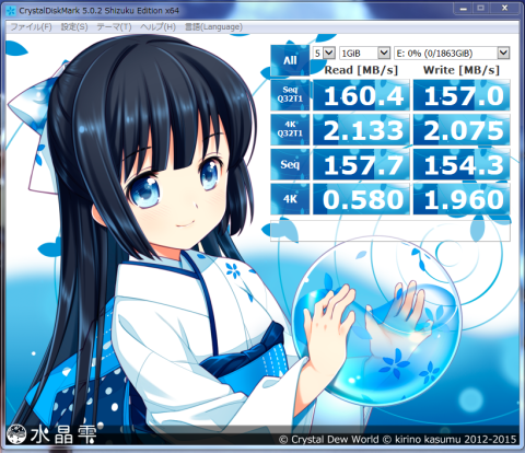 新品ということもあるのか、リード160MB/s越えましたね。ライトも160MB/s一歩手前まで来てます。