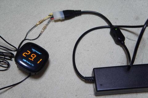 昔使っていた、外付け用ハードディスクアダプタを使いました。ペリフェラル4Pの1番と2番を、温度計のギボシに接続します。これだけです。+と-は、温度計で判断してくれるので、気にせずに接続してください。