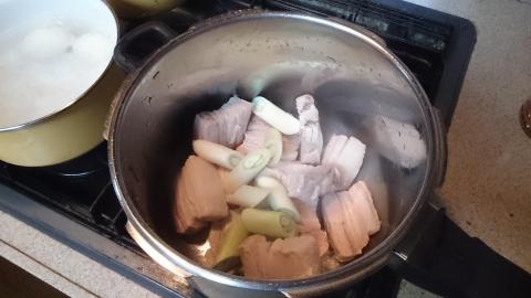 下ゆでした豚バラとネギを圧力なべに入れ、