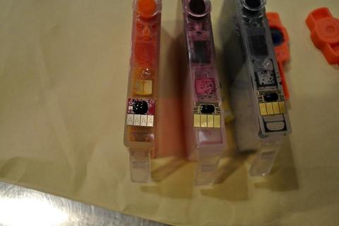 黄色カートリッジだけ残量が多かったので、ICをチップを移植して利用する より安価なカートリッジがはいっているままです。