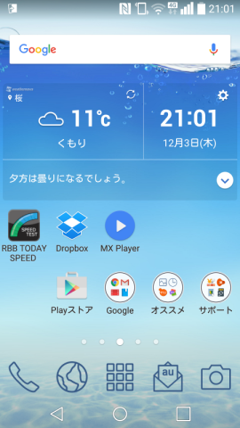とりあえず現時点でのホーム画面です。まだ殆ど新しいアプリなどは入れていませんが…。
