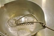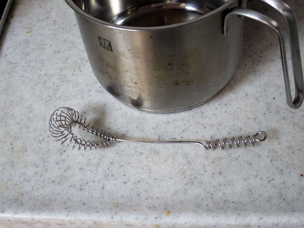 うちの奥さんはなぜかあまり使っているところを見た事無い道具を結構持っており、似たような泡だて器があったのでそれを使ったのですが、浅い雪平鍋が見当たらなかったのでミルクパンで作ってみました。