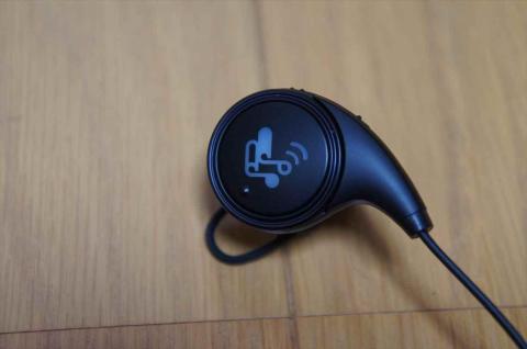 マークのところがボタンになっていて、電源のON/OFF、再生/停止、着信/終話が行えます。使用中は、青色のLEDランプが点滅します。