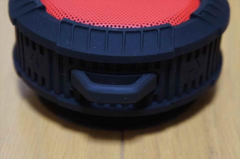 付属のカナビナフックを取り付けられます。左右には、ボリュームのボタンがあります。