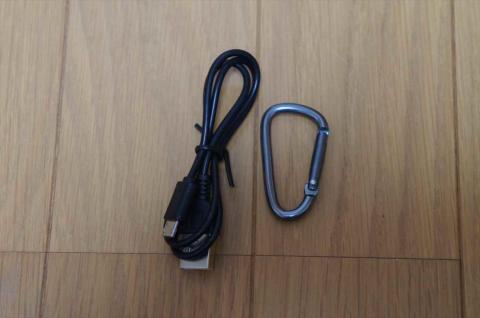 充電用のMicroUSB-USBケーブル1本と、カナビナフックが付属しています。